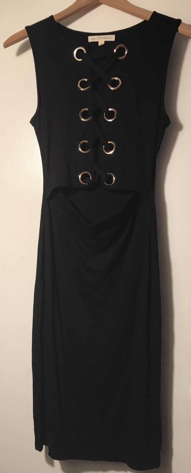 HOT & DELICIOUS DRESS - Cute tight cut off sleeves with gold rings, cris cross, open slit at belly area. COLOR: Black/Gold SIZE: Large 95% Cotton 5% Spandex