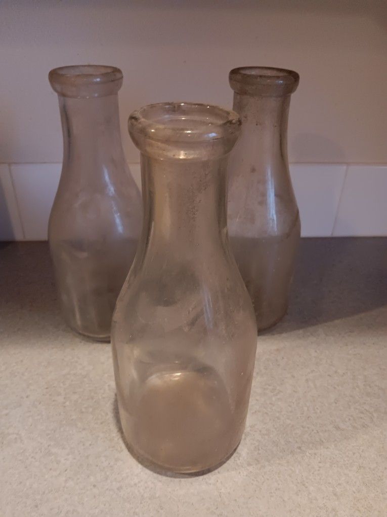 Vintage glass quarter jars. 1. "One quart liquid 997 registered sealed UCP51" on bottom 2. Thatcher Manufacturing Company, "MTC Registered One Quart Liquid" on bottom 3. Owens-Illinois Duraglas. "One Quart 17 oz ML 23 2 Duraglas" on bottom.