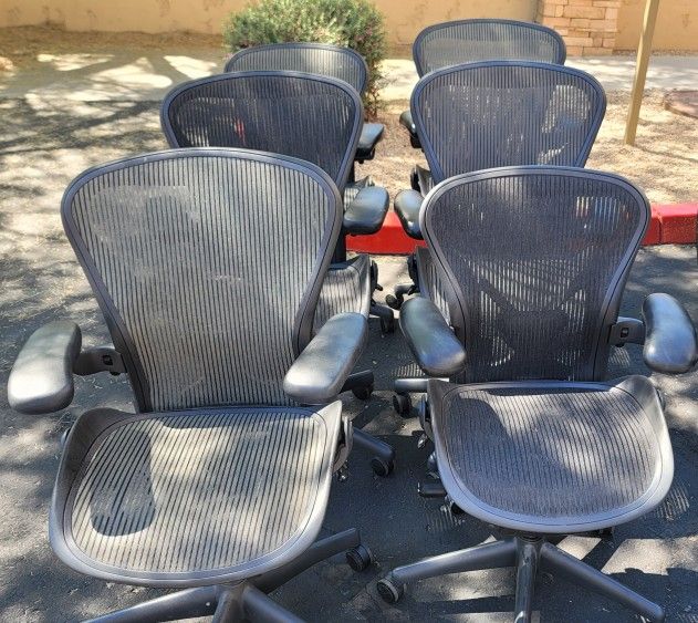 Size Bs and Cs 350 Each Newer Style Herman Miller Aeron Office Desk Chairs Has posture fit lumbar support Has upgraded heavy duty pneumatic hydraulic cylinder which will last longer than normal hydraulics you can tell by the metal sheath around the post These are the cleanest and the best shape you can get being a classic Venmo, Zelle, Cash, CC, Cash App Size B These are newer style classics which means they have the clips for the adjustable arms. The older style have the wheels for the adjustable arms Free delivery within reason Fully loaded and just about perfect paint No blemishes or issues All mechanisms work perfectly