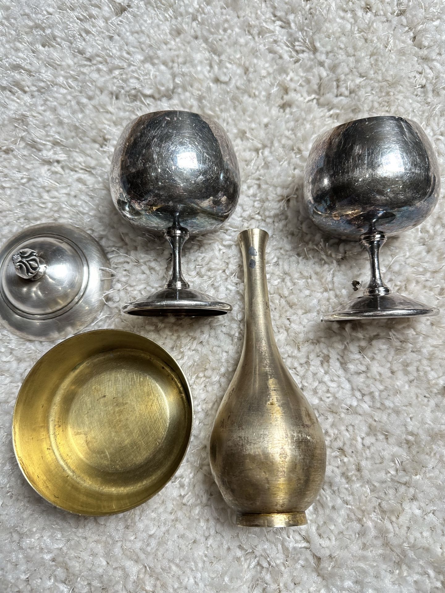 Beautiful vintage-style decorative set, perfect for home decor or display. Includes:• 2 metal goblets (silver-tone)• Brass vase / decorative bottle• Small lidded container• Decorative dish Materials appear to be brass and silver-tone metal. Condition: good vintage condition with natural patina (adds character). Perfect for:• Home decor• Vintage lovers• Shelf styling• Great for decor or staging 💰 Price: $25 for the whole set📍 Pickup in [Auburn] Message me if interested!