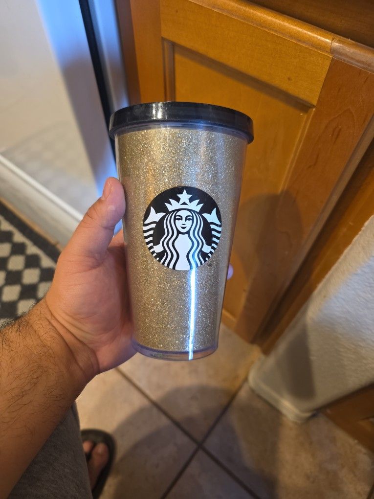 Double lined hot/cold gold starbucks cup. No straw