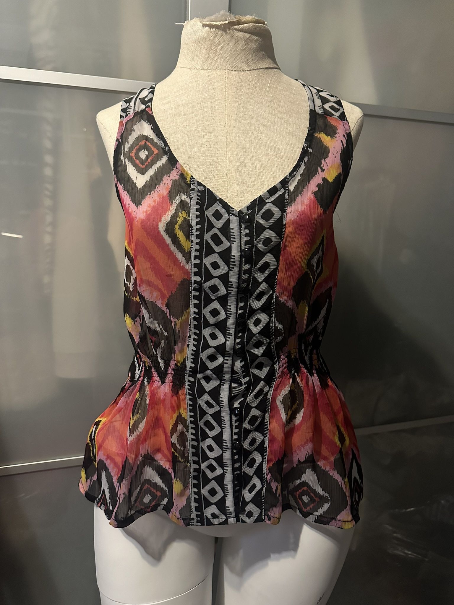 Vibrant sleeveless top featuring a striking pattern. Perfect for adding a pop of color to your wardrobe. Fits Size XS/S