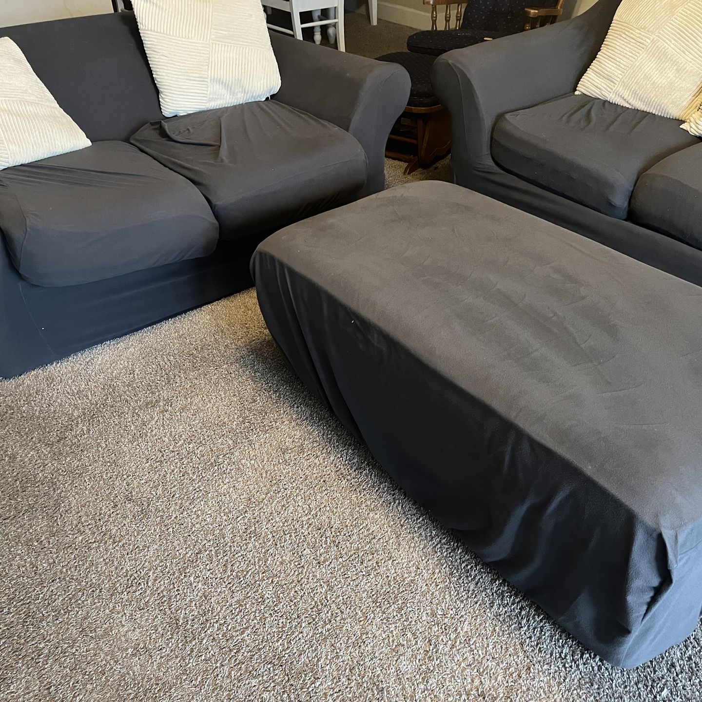 3 seater couch and a loveseat with a large ottoman. The large pillows are also included. This set is very comfy and has served our family well. We are getting a new set so looking to get rid of this one. The covers are very easy to wipe down/clean and are removable and machine washable. Pet free home Non-smoking home Large couch 90” in length Love seat 68” in length Ottoman 50”x26” Must be able to pick up from 2nd floor apartment.