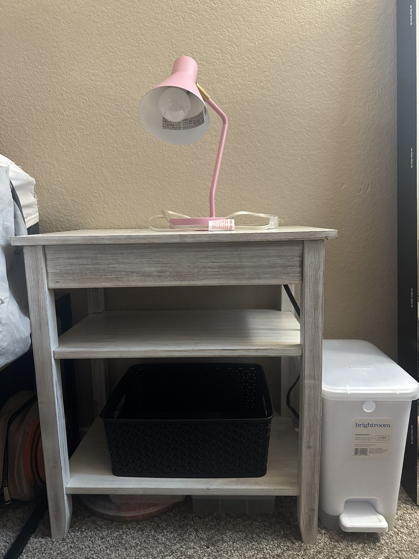 Nightstand with 1 plug and 1 USB port (other 1 of each do not work) Can include little lamp and trash if would like :) $60 for all OBO