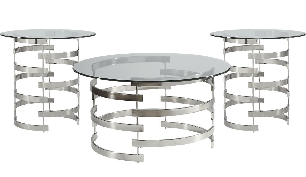 Set of 3 Contemporary Glass & Metal Tables – Excellent Condition. Comes with extended warranty! Selling a beautiful set of three matching tables: one large cocktail/coffee table and two end tables. Each piece features a thick tempered glass top with a sturdy modern metal frame. The sleek Baylor table set is perfect for those with contemporary taste. Inspired by distinctive modern art, each table features a beveled glass top, smoothly rounded shape and unique metal base with a brushed nickel finish. ✨ Purchased from Rooms To Go **Extended Warranty Included** ✨ Excellent condition – no scratches on the glass ✨ Contemporary style that fits easily with many décors Dimensions: cocktail: 36" diameter x 18"h, end: 26" diameter x 24"h Perfect for a living room or office space. 📍 Pick-up only – located in Orlando, FL
