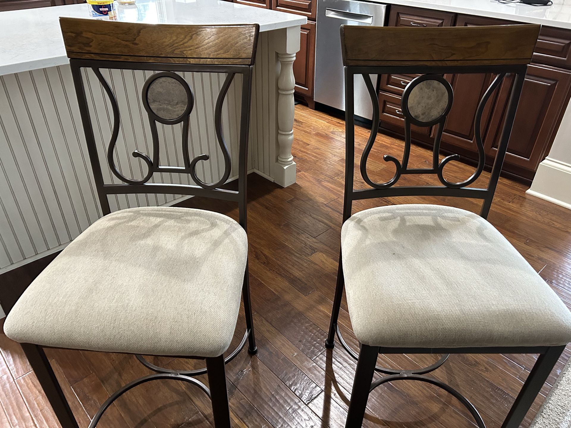 4 counter height bar stools. Part of kitchen table and chairs set, but will sell separately. Neutral decor, good condition, natural color