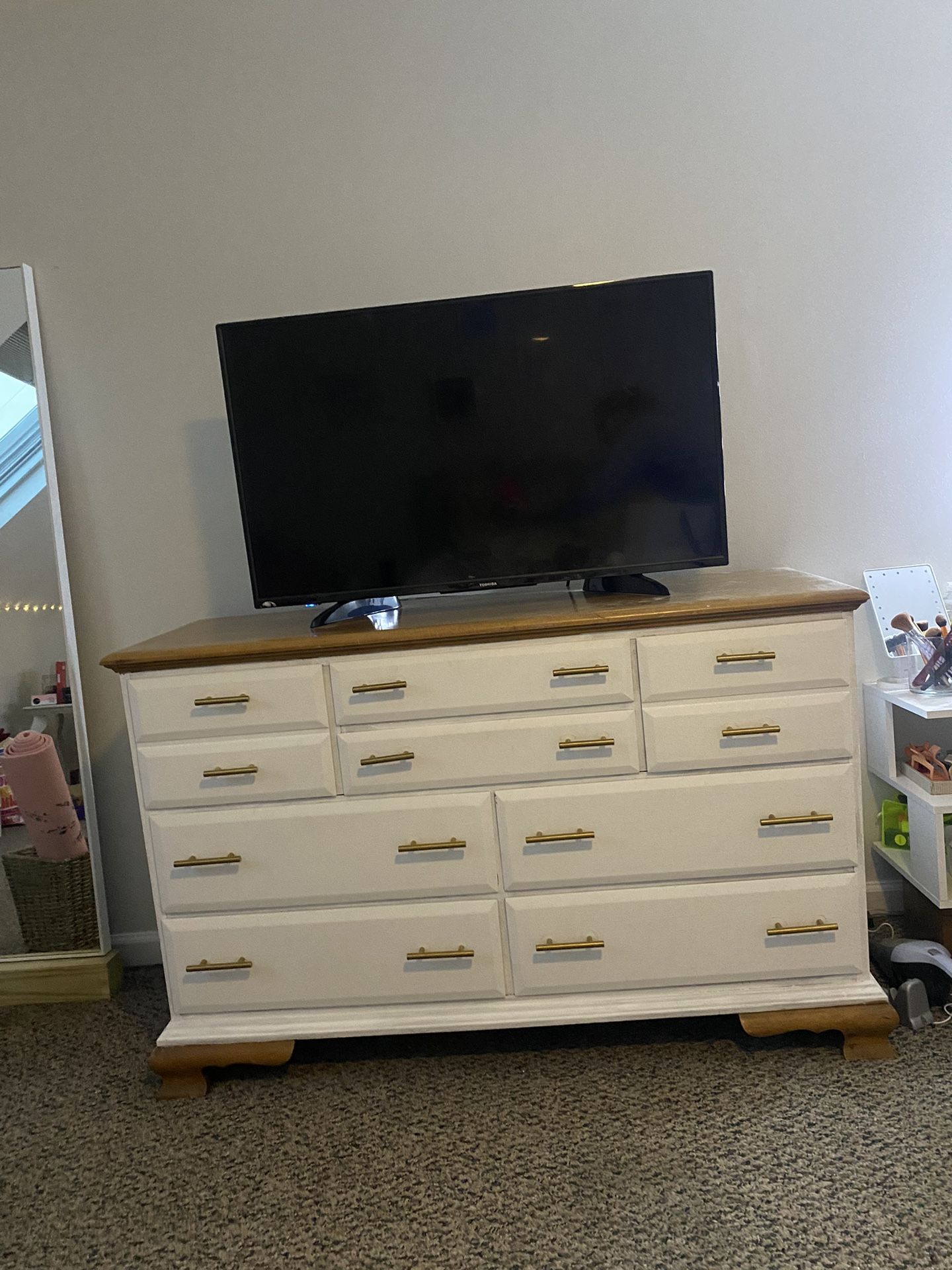 Large dresser, refurbished - newly painted and new hardware. 8 drawers, top row has two deep square drawers on either side with two shallow drawers in the middle. Bottom half, 4 large drawers all equal size. Great piece