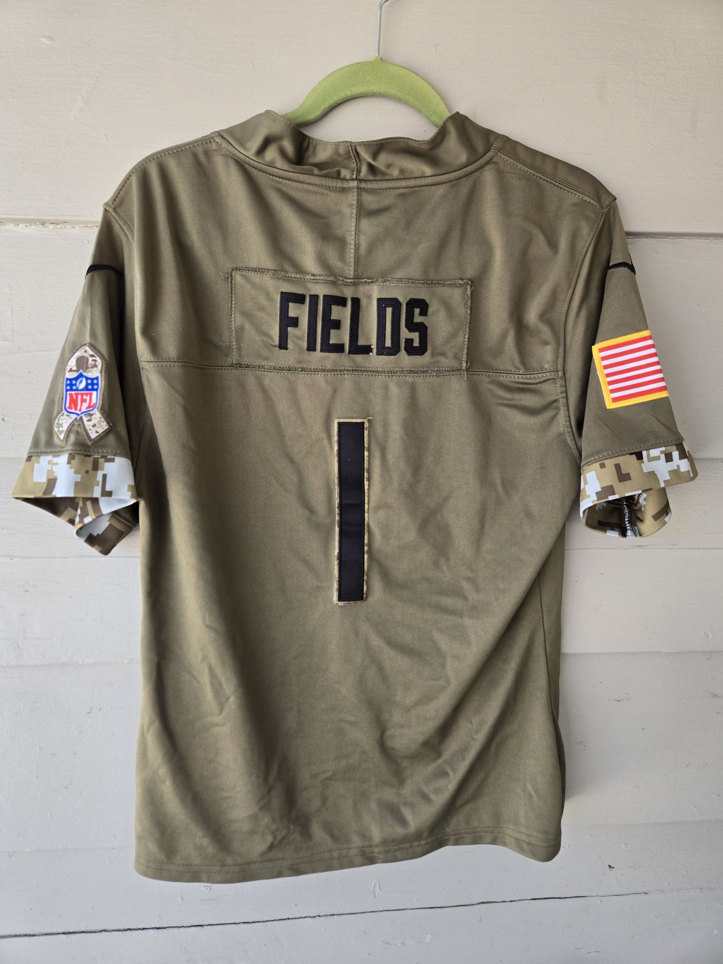 Cool Nike NFL Chicago Bears Justin Fields #1 jersey. This is the Salute to Service style with the olive green color and camo accents on the sleeves. Has the American flag patch on one sleeve and the NFL ribbon on the other. Size M.