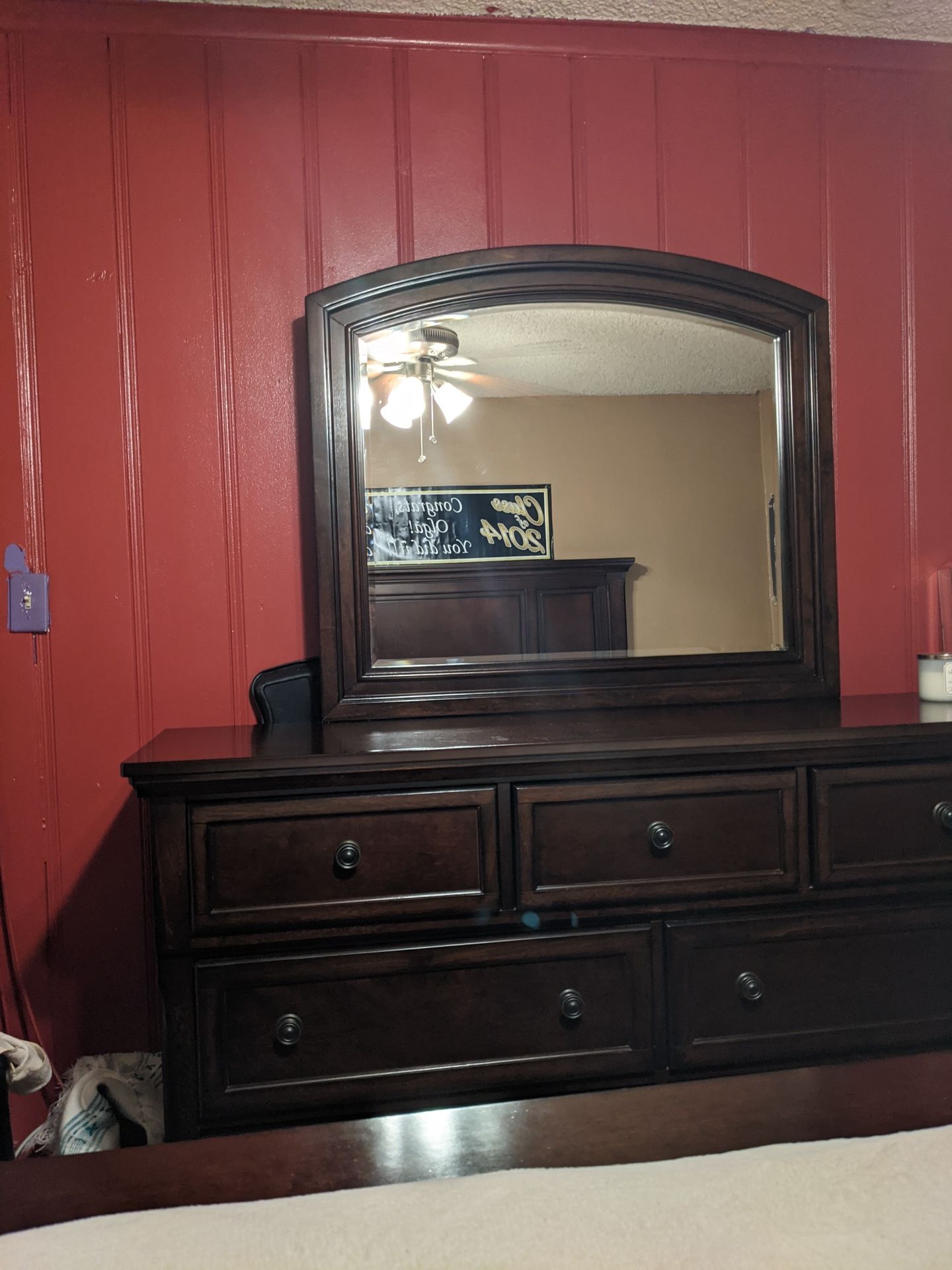 King size bed with matching drawer and mirror set all in good condition $800 obo