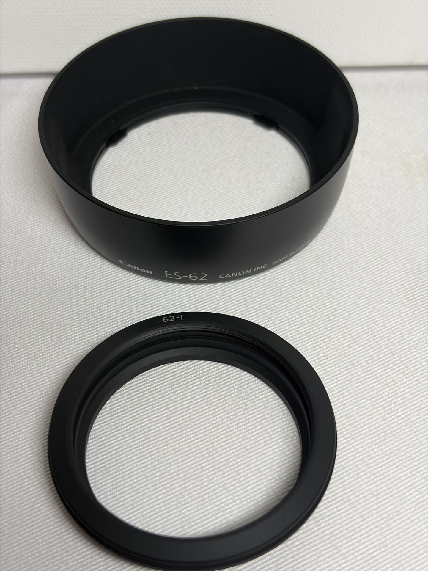 Genuine Canon ES-62 screw-in lens hood (plastic) • Never used • Includes 62mm metal threaded ring marked “62-L” • Both in excellent condition • No cracks, dents, or cross-threading • Fits lenses with 62mm filter threads • No lens included Untested since I don’t have a 62mm lens..