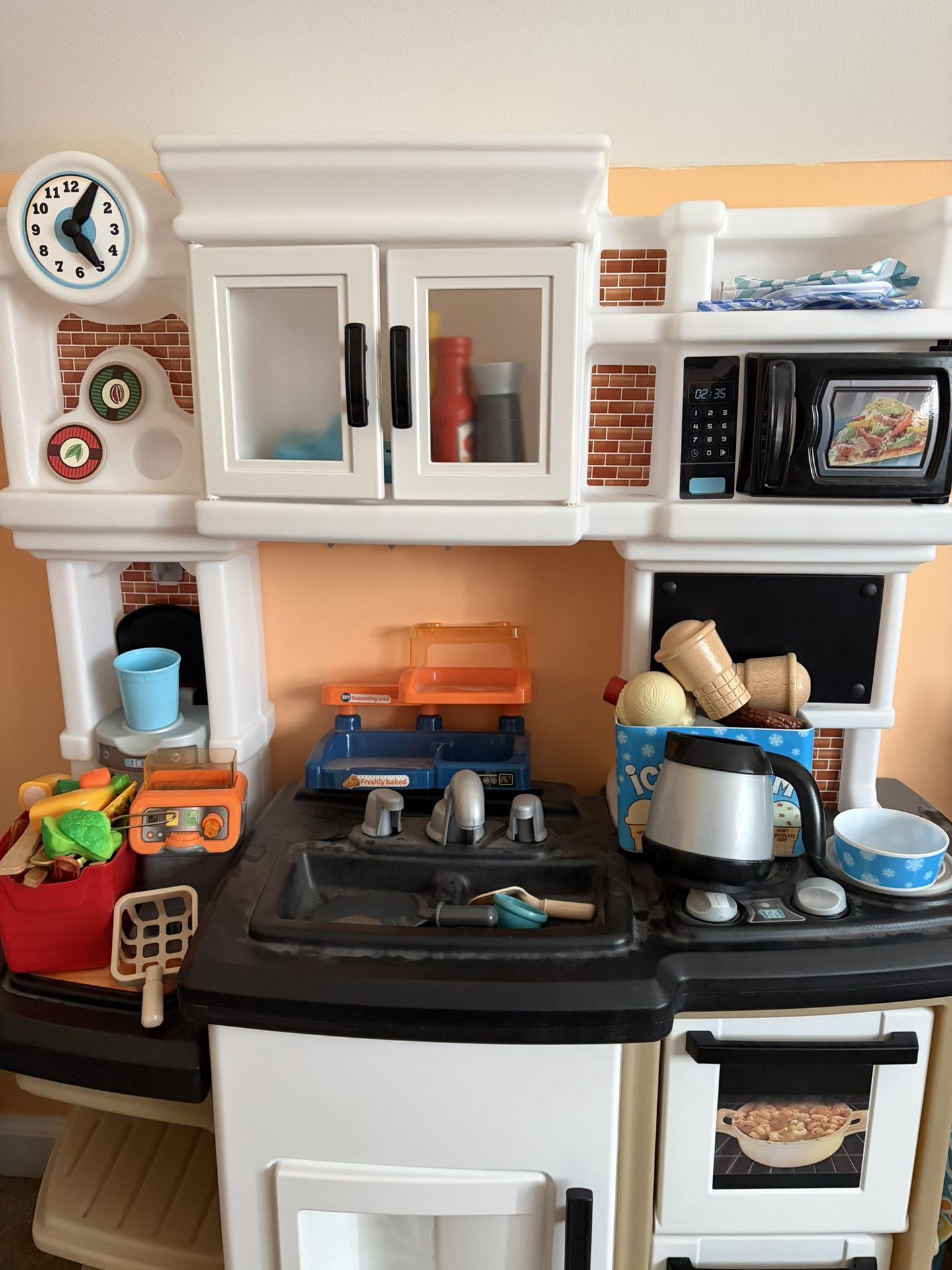 A kitchen play set with dishes pots utensils toy food and other accessories, up for donation. Kids have aged out of them and free to family with kids who will enjoy them. Some parts may be missing.