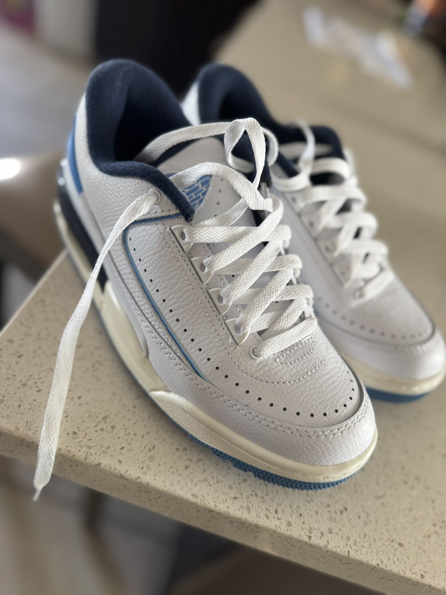 White / midnight navy / university blue size 7y. Basically new. My loss your gain. My kid says they were too tight for him.