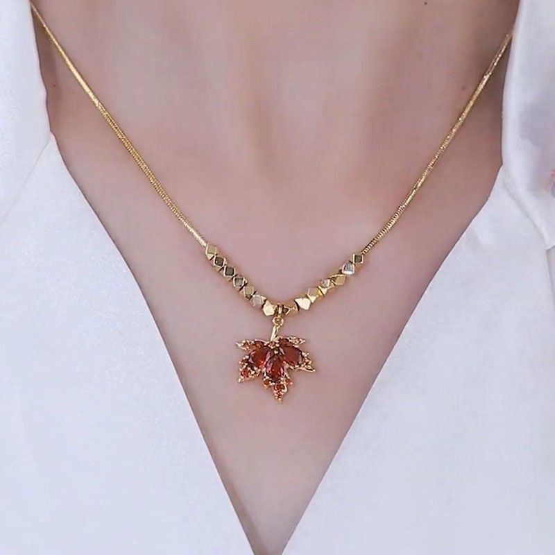 Red Maple Leaf Pendant Necklace, Gold Plated Zircon Gold Plated Necklace, Zircon Inlaid Pendant, Fashion Design Exquisite Workmanship