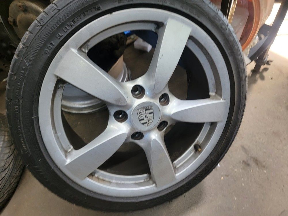 Staggered Porsche rims and tires, 1 tire and rim cracked/damaged, rest are good asking $800 for all or will sell separately. Message me if serious buyer.