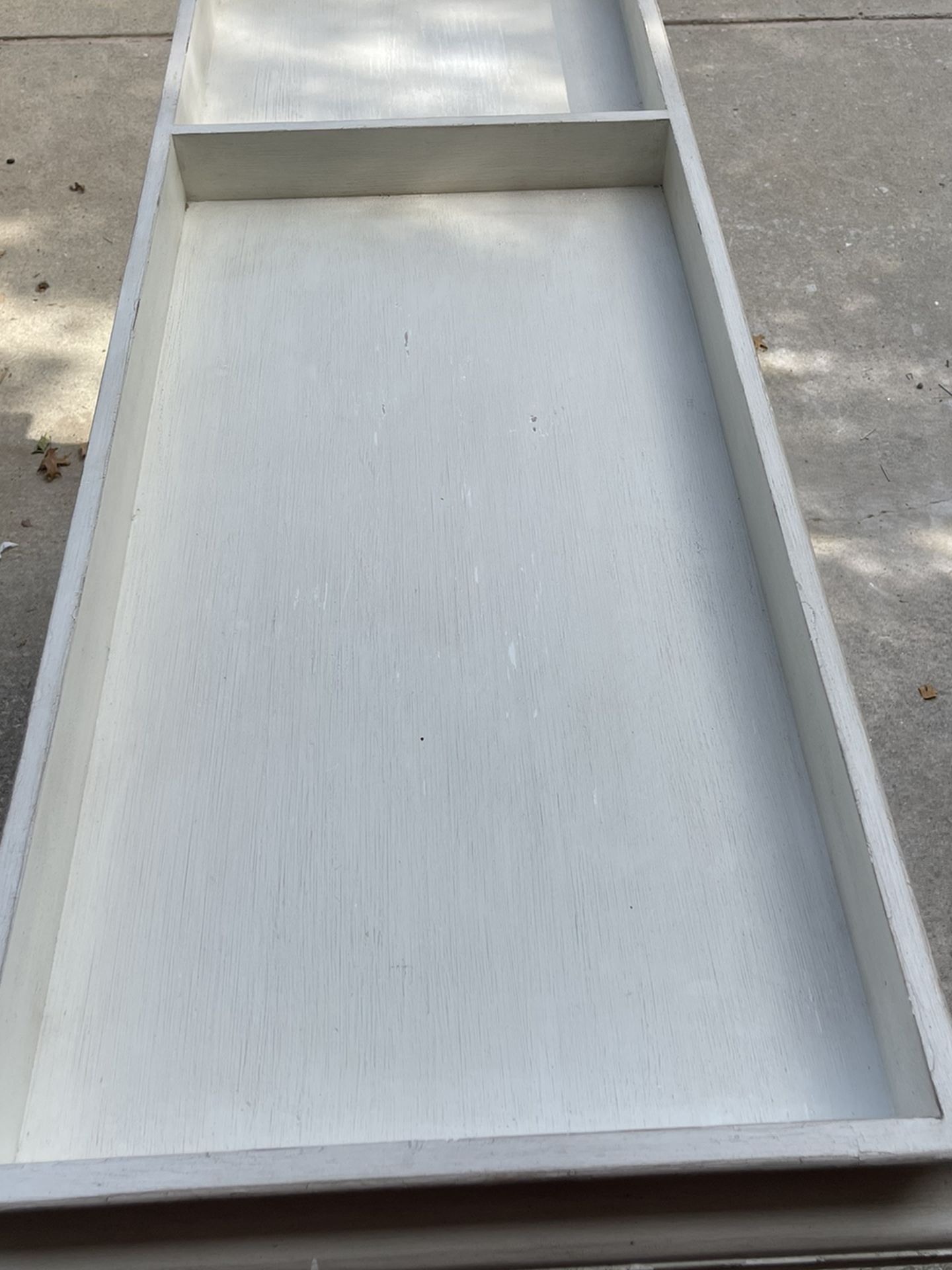 Changing Table that fits on top of a dresser. Changing pad fits perfect in the large opening. Normal wear and tear. Can be fastened down to dresser with the clips on the back.