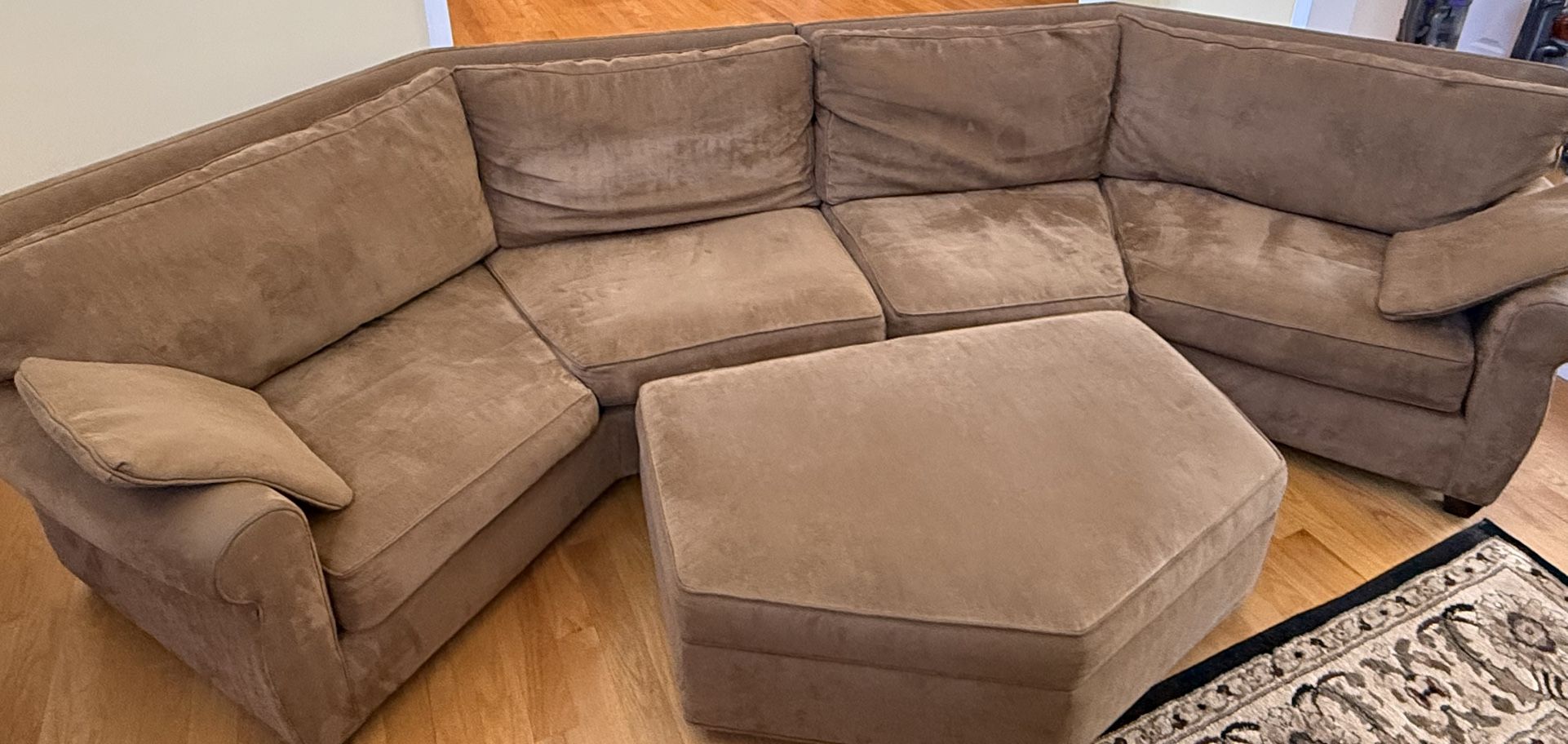 Two piece sectional couch plus ottoman, diamond shape. Down cushions. Extremely comfortable. Well well-made and cared for. High-end sofa. 36” deep 154” long 33”height. Couch is 2 sections Ottoman is on wheels: 48” long 33” deep 16” height