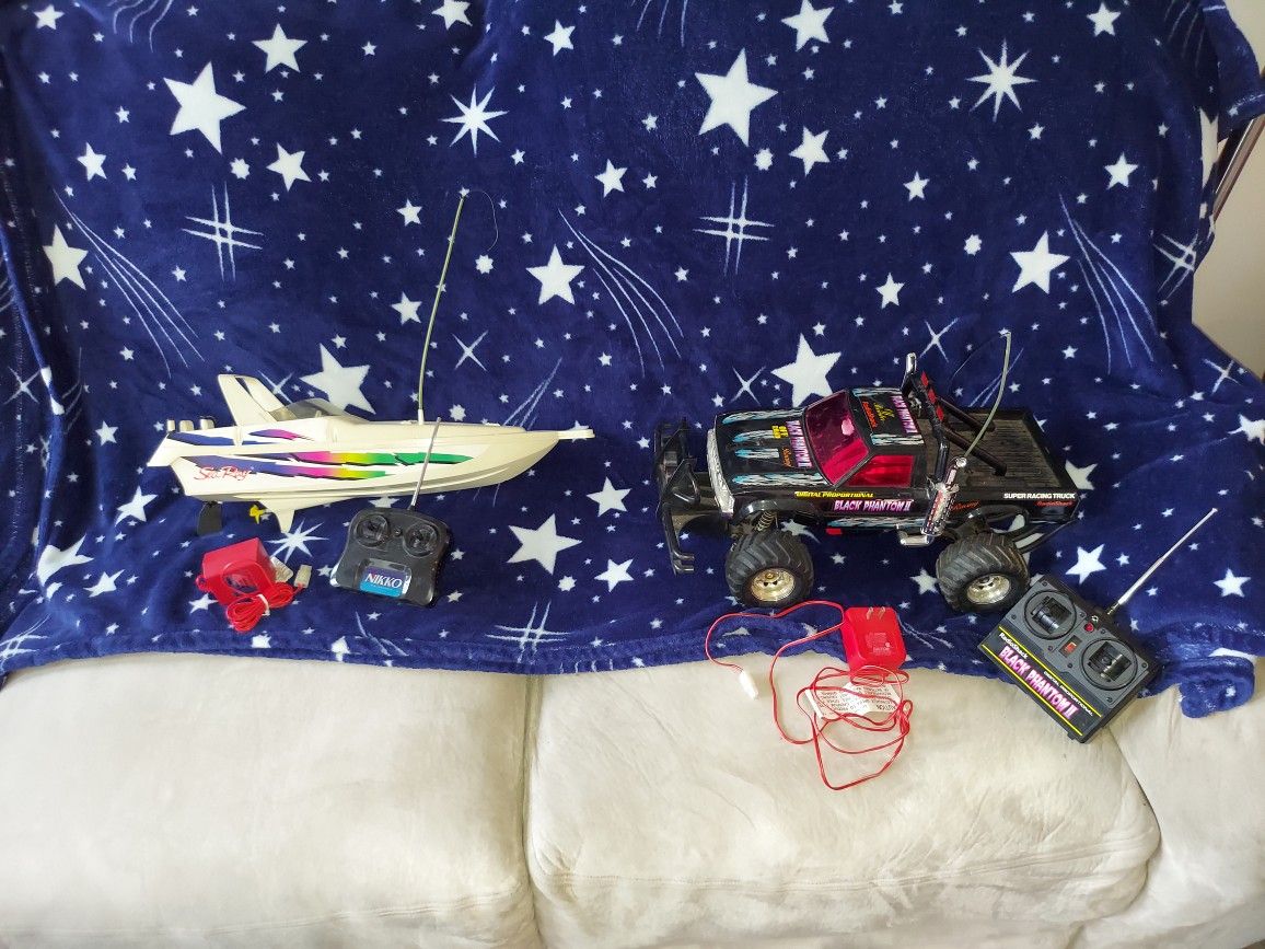 Nikko, sea ray 20" remote control boat, with batteries and charger, and controller, ready to use, plus Radio Shack , Phantom II, black truck, batteries, charger, and controller, ready to use, will sell the 2 for $100, I will sell them separately, text me for a price. The better deal is the 2 for $75