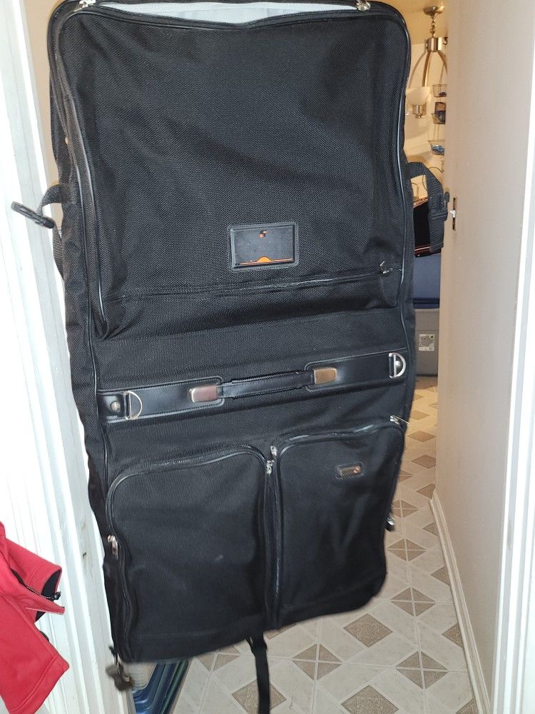 Heavy duty full garment bag with carrying pockets and external xtra compartments And carrying shoulder strap. Great condition also use to store clothing