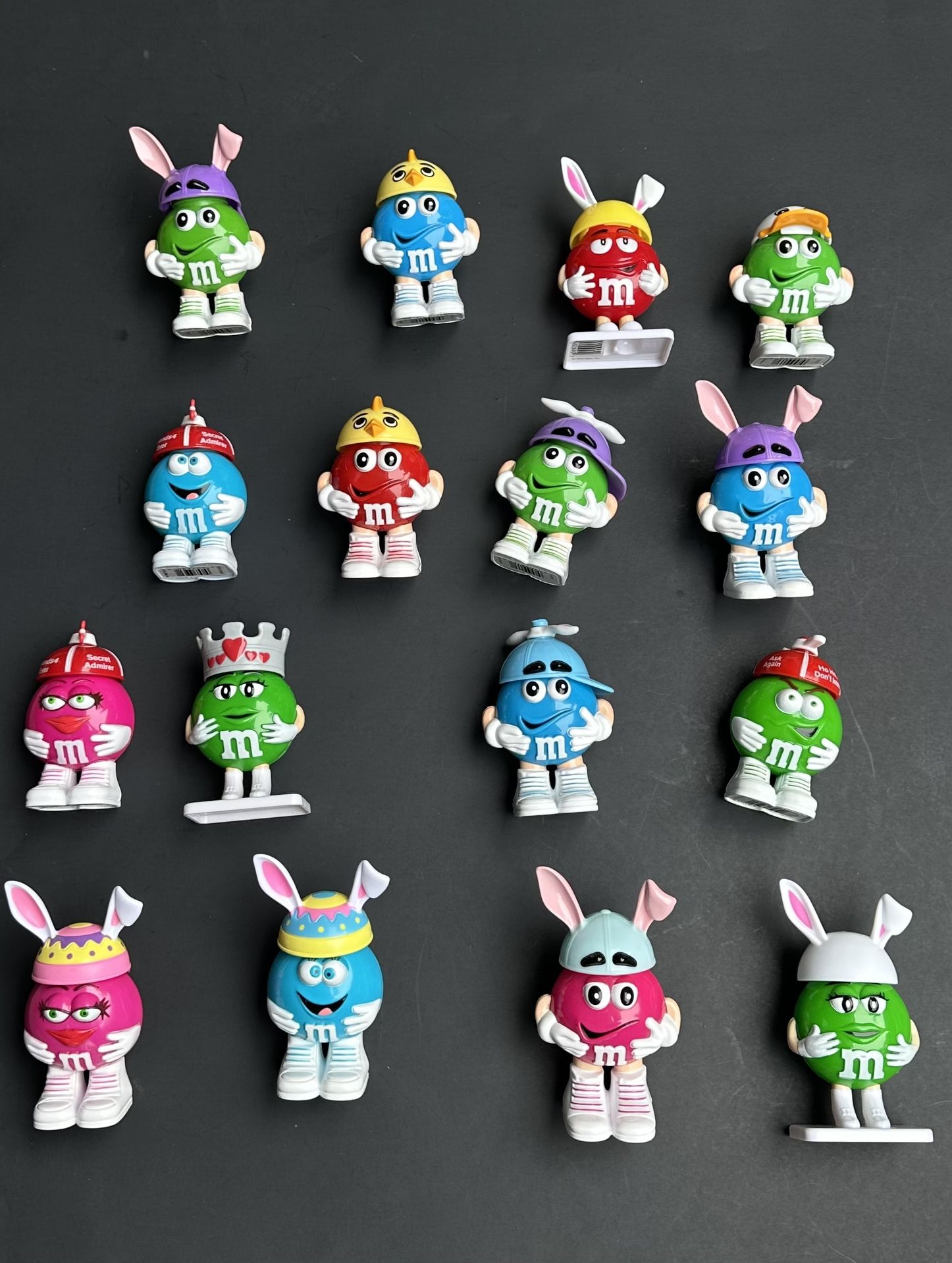16 m&m figures for valentines, Christmas, and Easter with tags Hats can be removed and interchanged $5 each or $60 for all