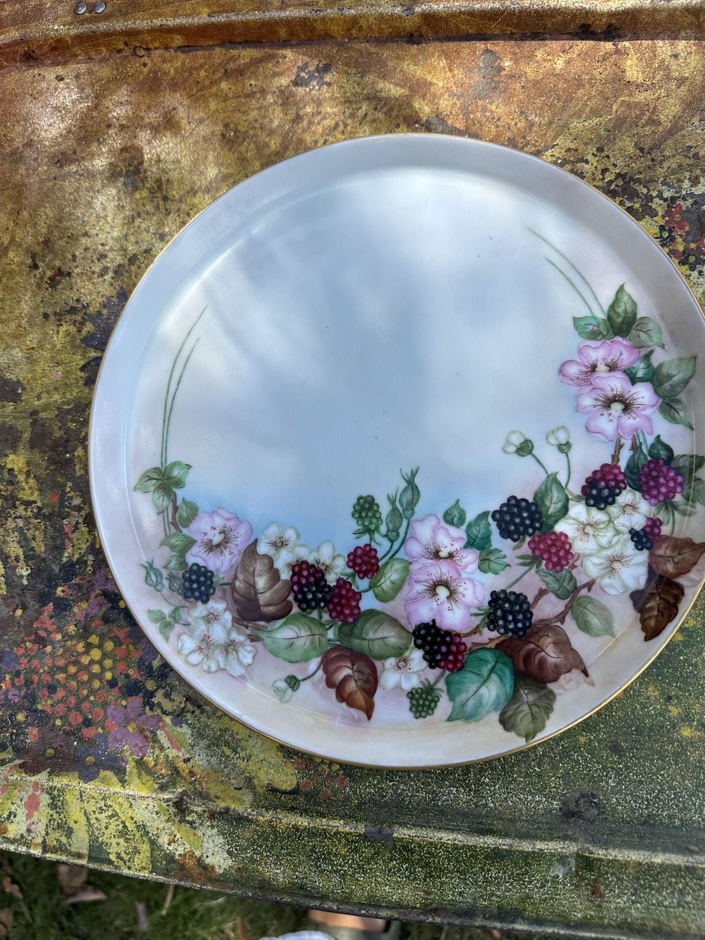 This is a hand-painted porcelain decorative plate with a floral and berry design.
