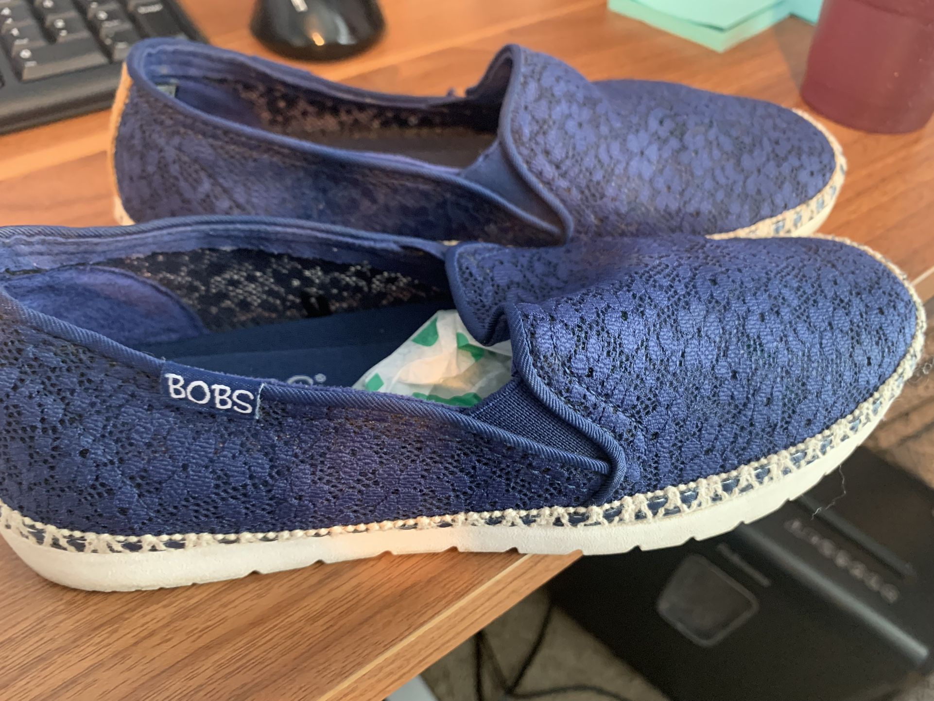 These are lightly used memory foam shoes from Bob’s. They are a navy blue color with a lacy material. They are size 7. I included the bottoms, so you could see the wear and tear on them, but they are very well-maintained on the inside.