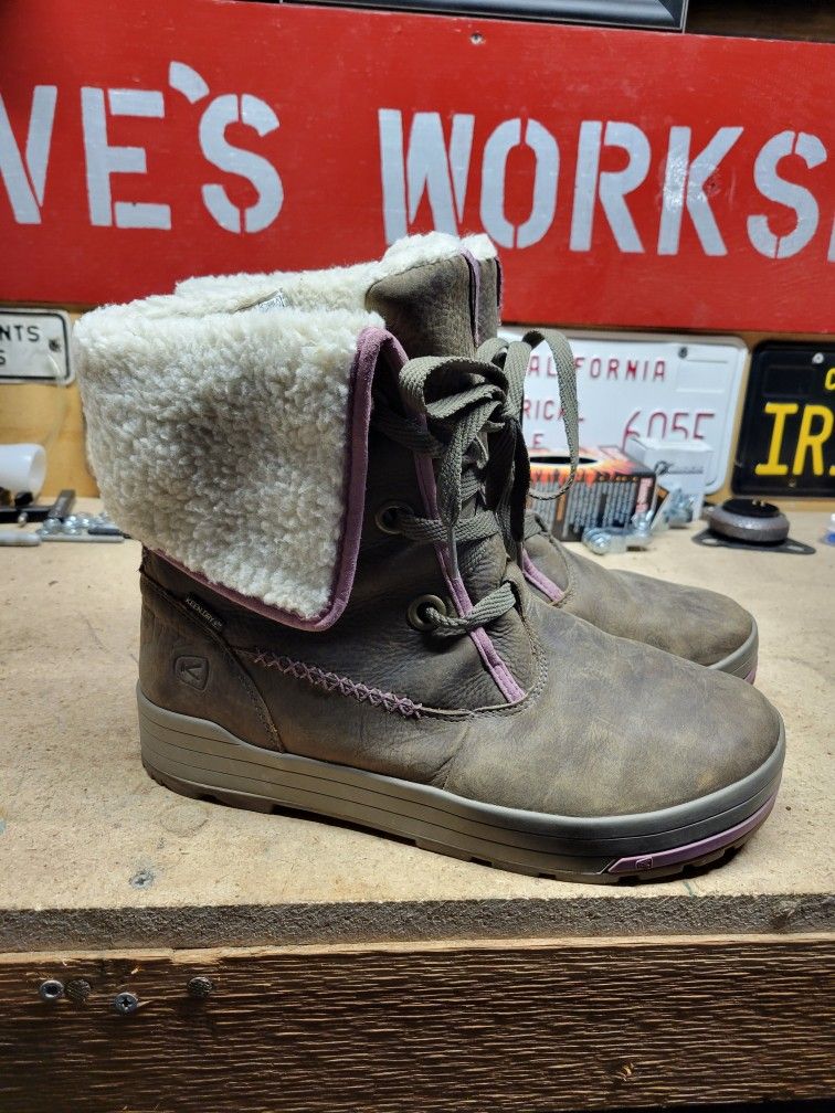 Keen Women's Snowmass Waterproof Low Boots in brown leather with a faux shearling lining.
