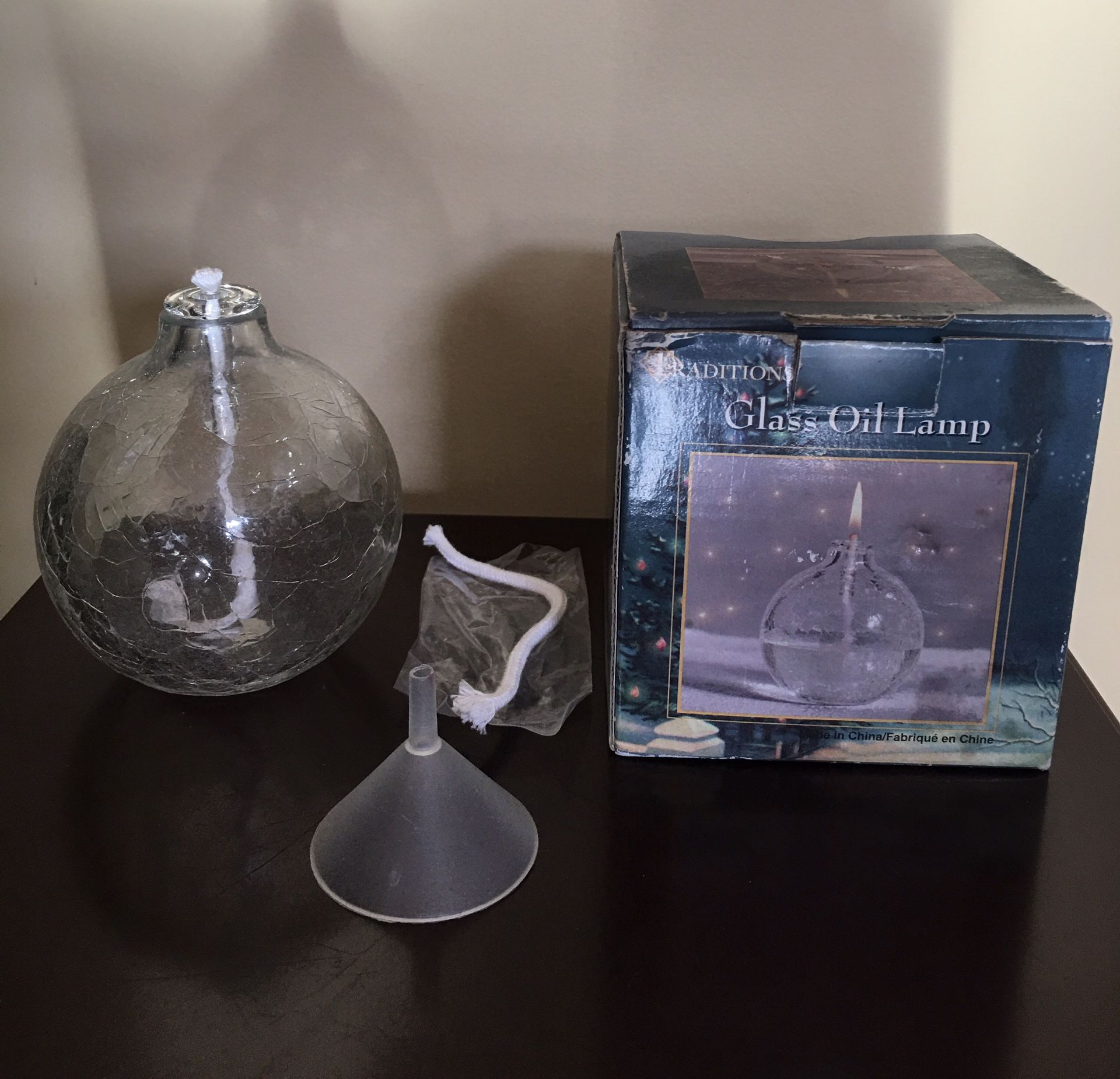 Traditions Glass Oil Lamp Handblown Original Clear Crackle 3.5” Glass Round Ball China Oil not included. Brand new in box. 3.5" diameter Includes funnel, glass tube and 2 wicks along with instructions.