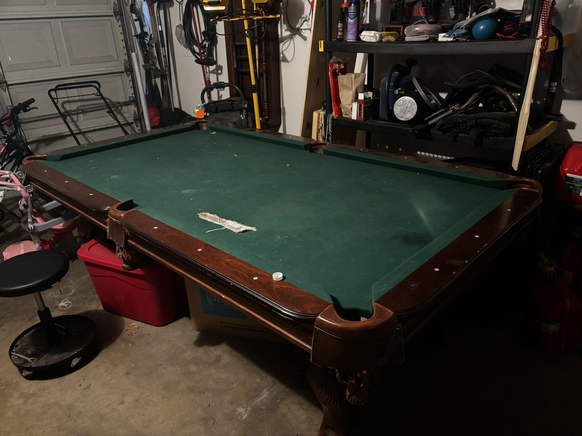 Pool table with all balls, 3 cues and a dartboard rack for balls, darts and cues. Needs new felt. Selling as is.