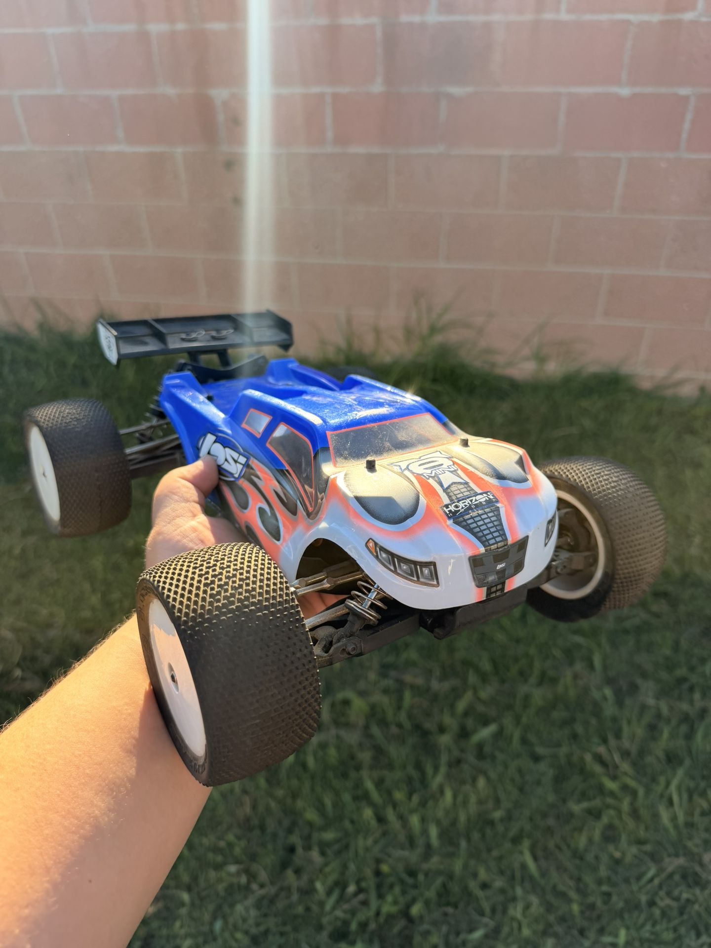Losi 8 T 1/14 rc car. This car is good condition. It has no battery it has a charger and control. One of four tires ripped and one the axles popped up. And it has the original box and paperwork.