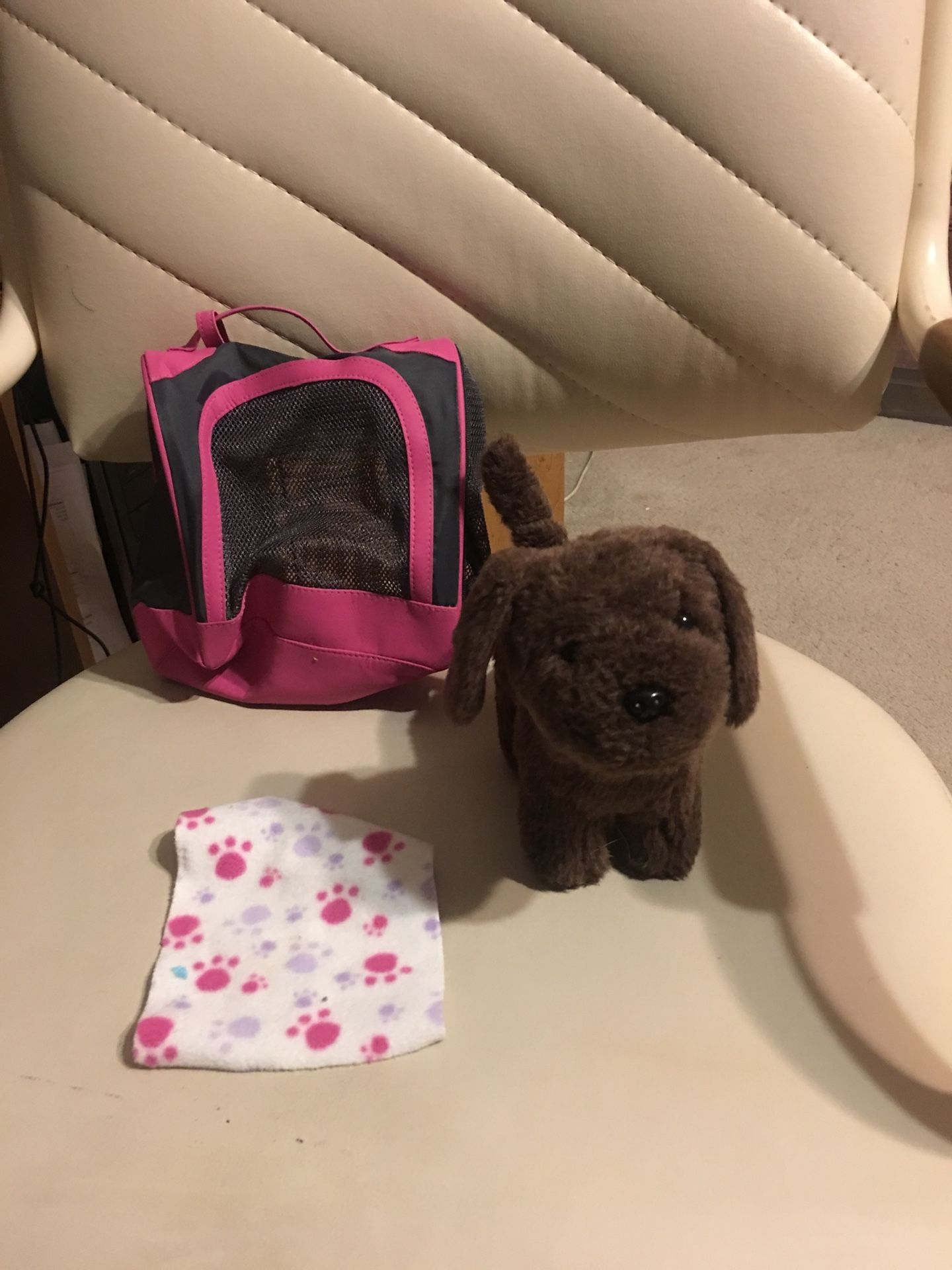 American girl pet carrier, pet towel and pet carrier for an 18” doll . Doll not included . Chocolate dog has a tear please. See picture other than that is okay .