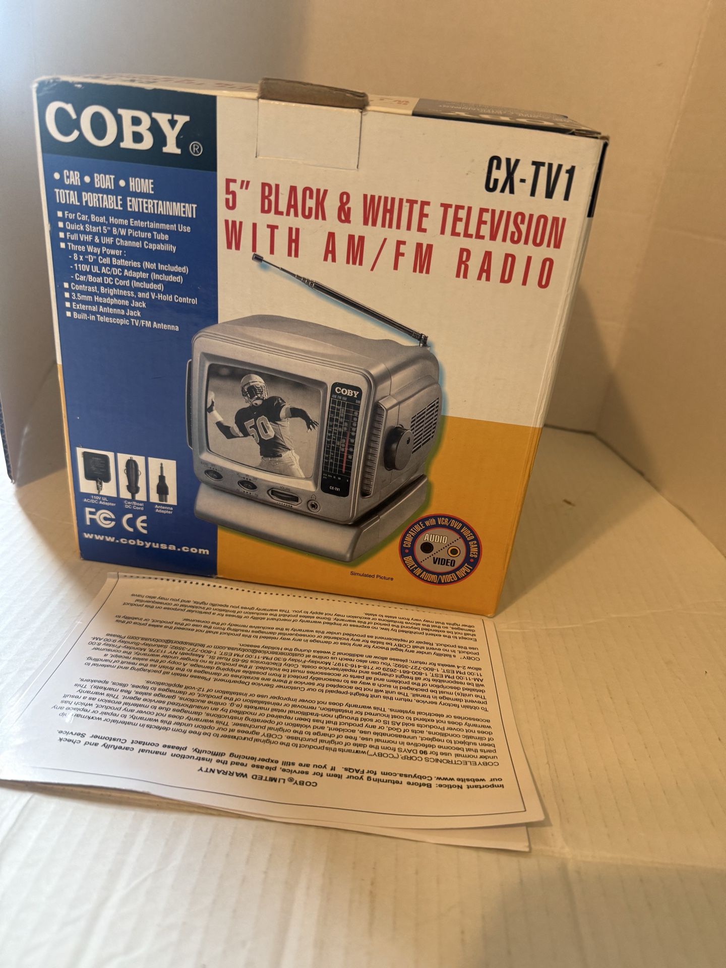 Coby CX-TV1 5" Black & White Analog CRT , AM/FM Radio Television. New In Box