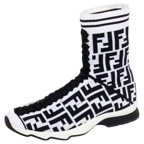 Fendi Black/White Knit Fabric Logo Sock Sneakers Size 37 100% Authentic Like new condition. A high-fashion take on a practical style, these sneakers from Fendi come in a high-top sock style. They feature logo details all over and chunky rubber soles. Designed to help you walk in comfort, this knit fabric pair is a buy you will cherish.