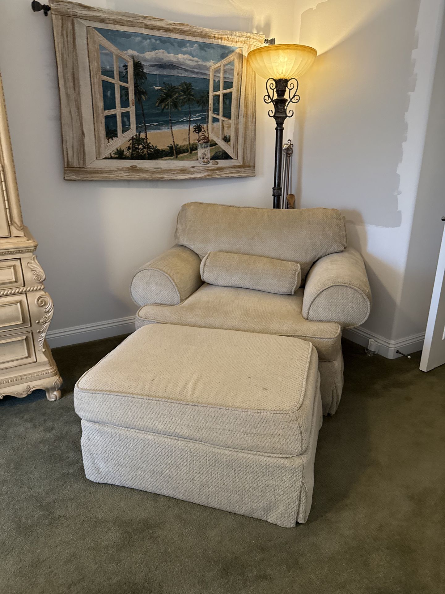 Oversized chair and a half with ottoman and lumbar pillow. Material is chenille. Very cozy!