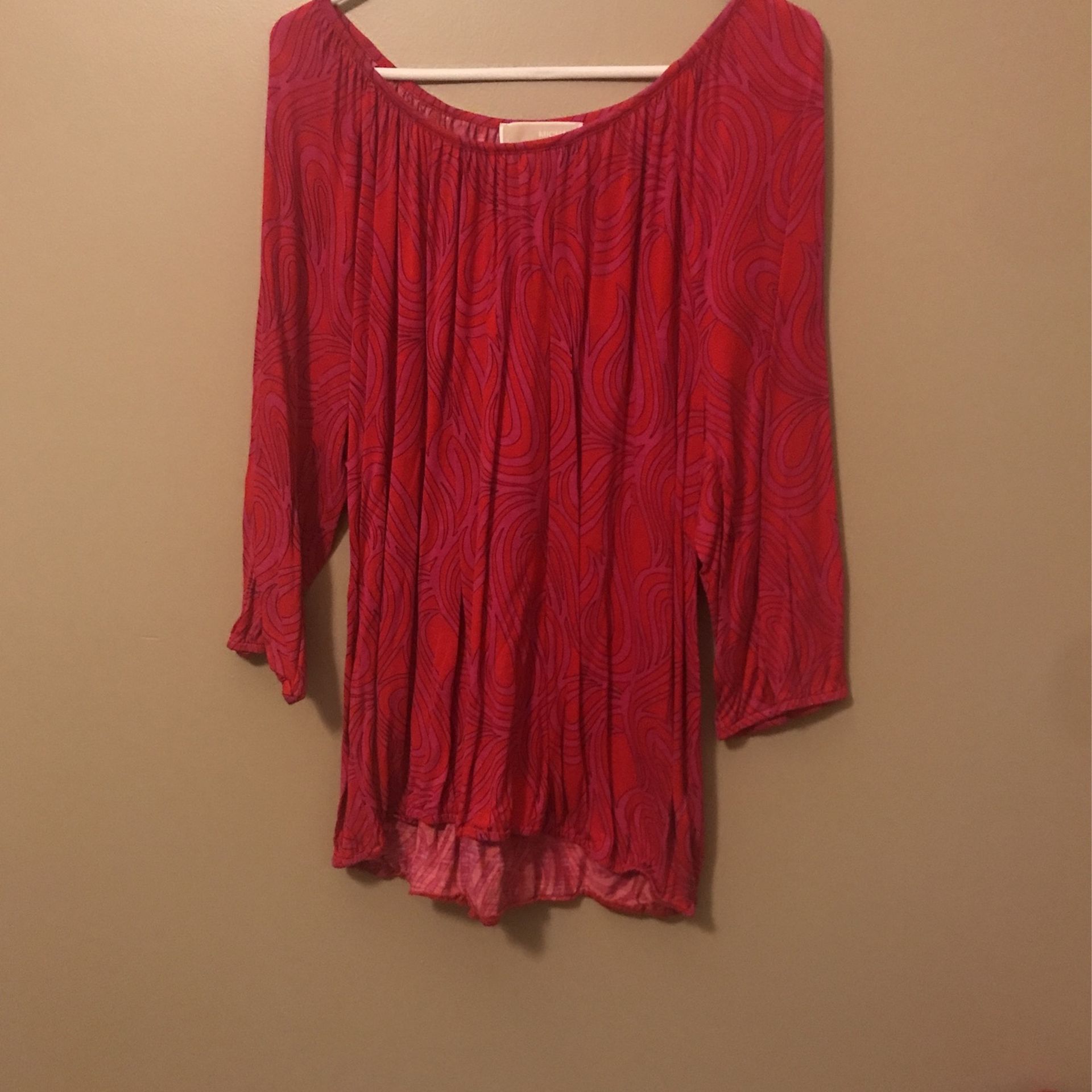 Michael Kors tunic with a red base and a pink swirl. 3/4 length sleeves with light elastic on sleeves and Hamline. Please check out my other listings as I have a ton of additional Michael Kors clothing for sale and would be happy to give you a bundle price and combined shipping. Please PM me