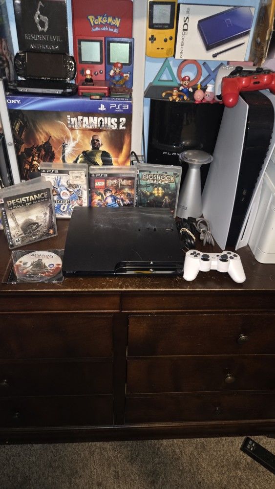 PS3 Slim 160GB Power cable Controller charging cable 1 Controller ( new but not original) 5 Games: Resistance Fall of Man Assassins Creed 2 - disc only Madden 13 Lego Harry Potter Years 5-7 Bioshock Everything tested and working