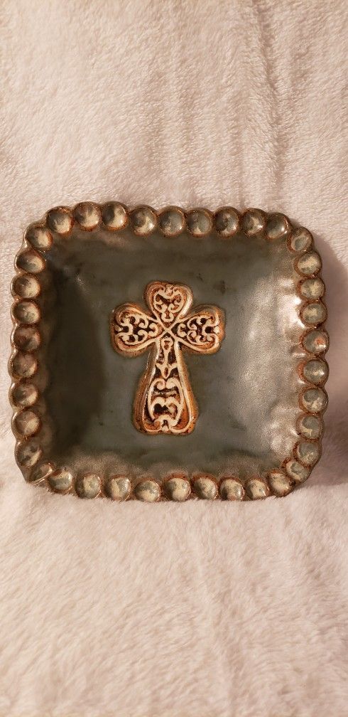 Etta B. Pottery handcrafted square celtic cross trinket dish or small appetizer platter. Artist stamped on the bottom. $28