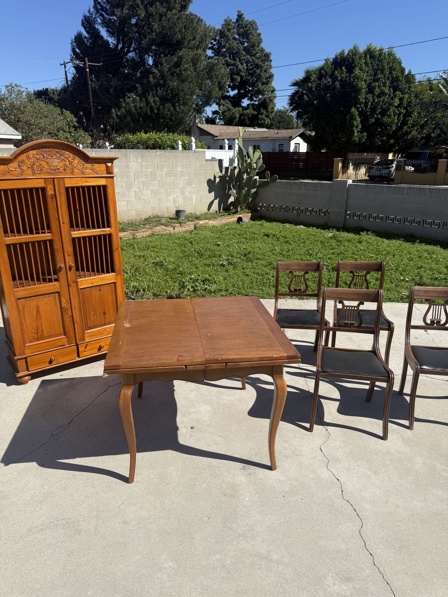 vintage pine armoire / cabinet with carved crest Vintage Lyre Back Dining Chairs – Set of 4 Vintage Drop-Leaf Dining Table Best offer takes it today need gone asap