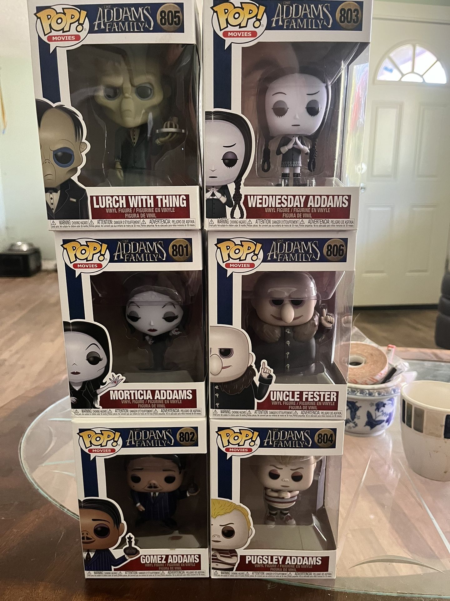 The complete set of Addams Family characters includes Pugsley Addams, Wednesday Addams, Gomez Addams, Uncle Fester, Lurch, and Thing, along with Morticia Addams. This entire collection is available for $100.00.