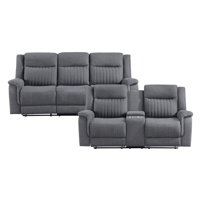 Brand New Gray Polished Microfiber Manual Reclining Sofa + Loveseat With Cup Holders
