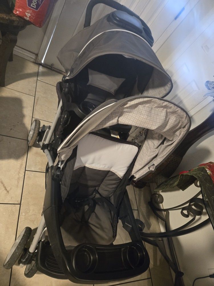 Very practical double stroller for two babies.