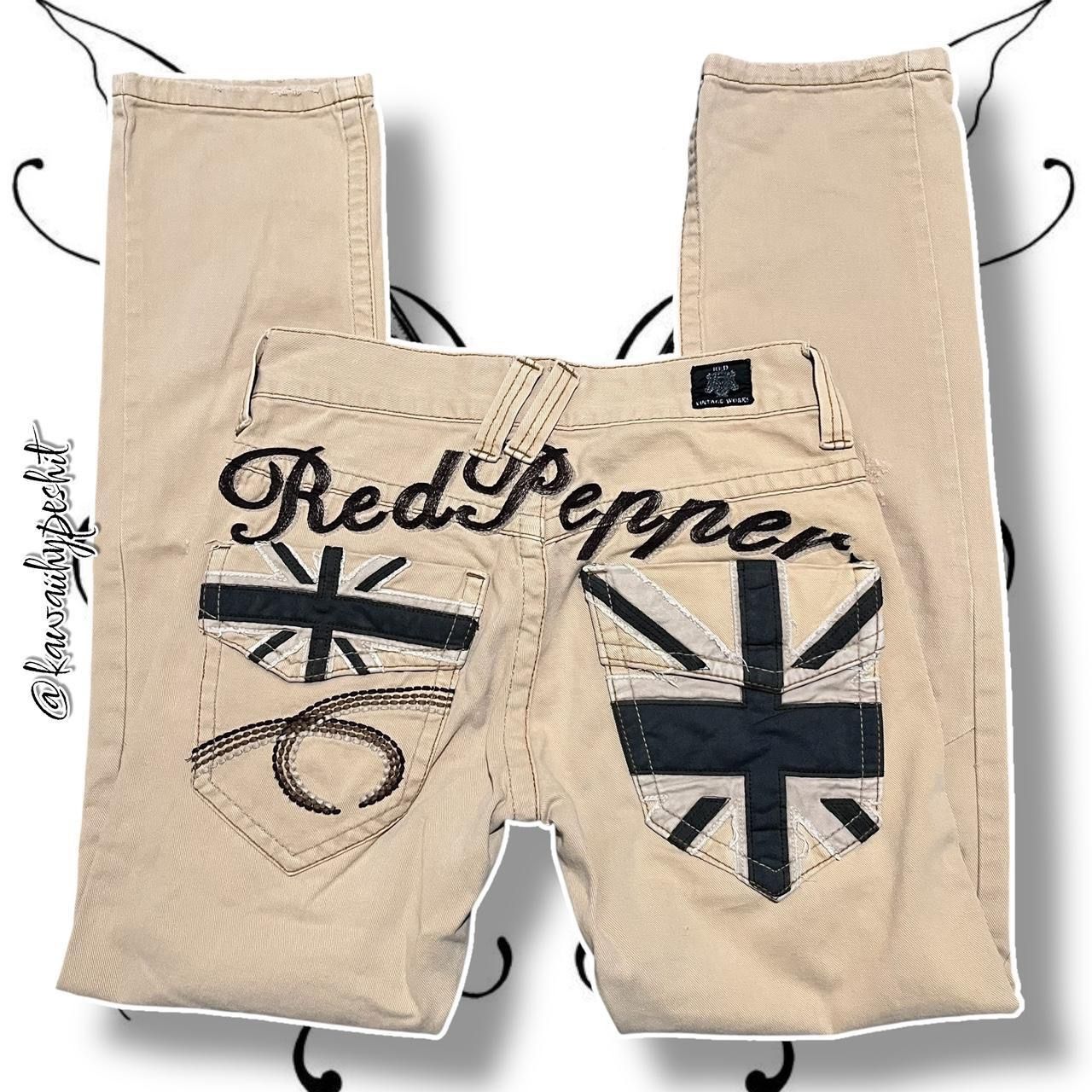 Brand: Red Pepper (Japan brand, well-known for its elaborate back-pocket embroidery/embellishments & Y2K streetwear aesthetic) - size: 28” Measurements (laying flat): - waist: 14” (28" all around)! No stretch! - rise: 8.5" - inseam: 31” - outseam: 39.25" - leg opening/hem: 6.75” Flaws: shown in pics - Large "Red Pepper" logo embroidered across the back yoke. Distinctive Union Jack flag design on the back pockets. Distress details in the front! Cool skull graphic detail on the buttons/hardware! Has a grunge, punk, streetwear, indie sleaze, kawaii, & j-fashion vibe to it! Pick up in Rowland Heights Payments accepted: Cash/Zelle/Venmo/Apple Pay