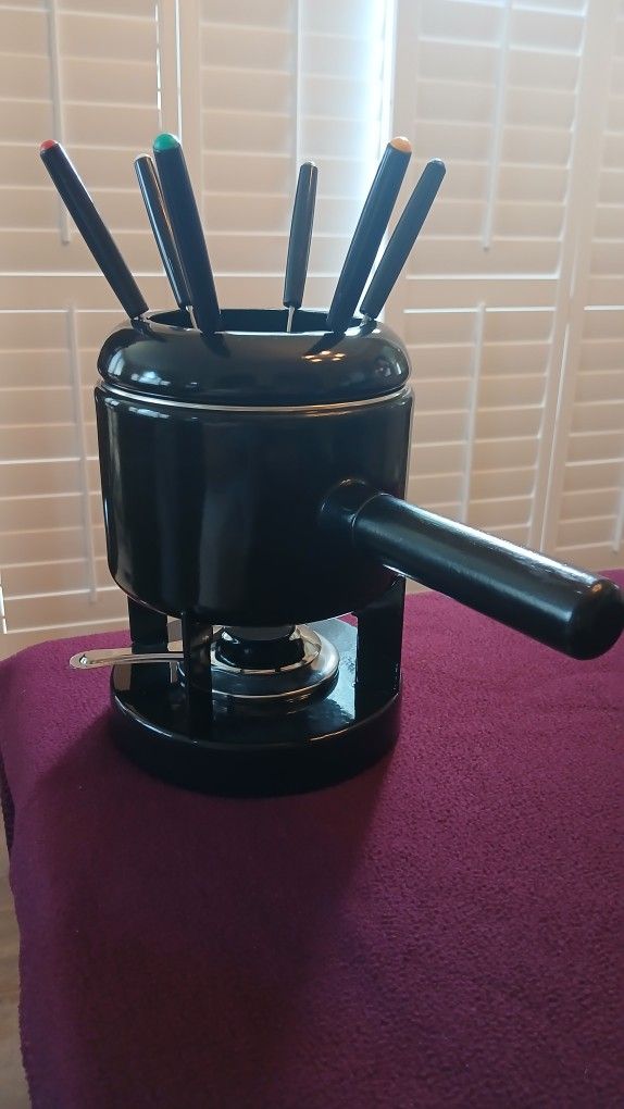 This fondue set consists of 11 pieces: stand, burner, snuffer, pot, splatter shield, 6 color coded forks and includes Use and Care instructions. Never used.