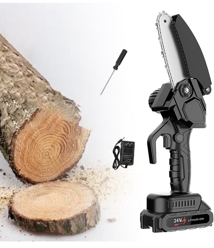 Electric chain saw, switch to prevent accidental start of the machine; heat dissipation; non slip handle, comfortable grip 【High Power Saw】: Sawing Machine made of all copper, can withstand high temperatures of 200C, fast cutting speed, effectively improve work efficiency 【Product Size】: Handheld chain saw 32.5 cmx12.8 cm/12.8 inchx5.04 inch, lightweight, 0.8kg, can be operated with 1 hand 【Applicable Scenarios】: Woodworking cutter is suitable for felling and chopping wood, cutting trees and pruning, gardening harvesting, forestry harvesting, etc 【Electric Chainsaws】: Smart chip, fast charging; power 200W, peak pressure 28 Bar, battery capacity 6000 mAh, battery life about 20 minutes
