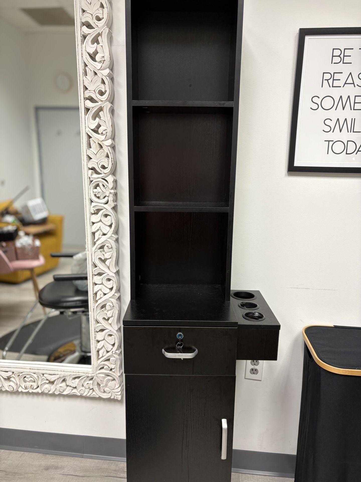 Lightweight heavy duty in great condition tower station for at home or business needs. Drawer and cabinet with shelving in the tower station, key still with it!