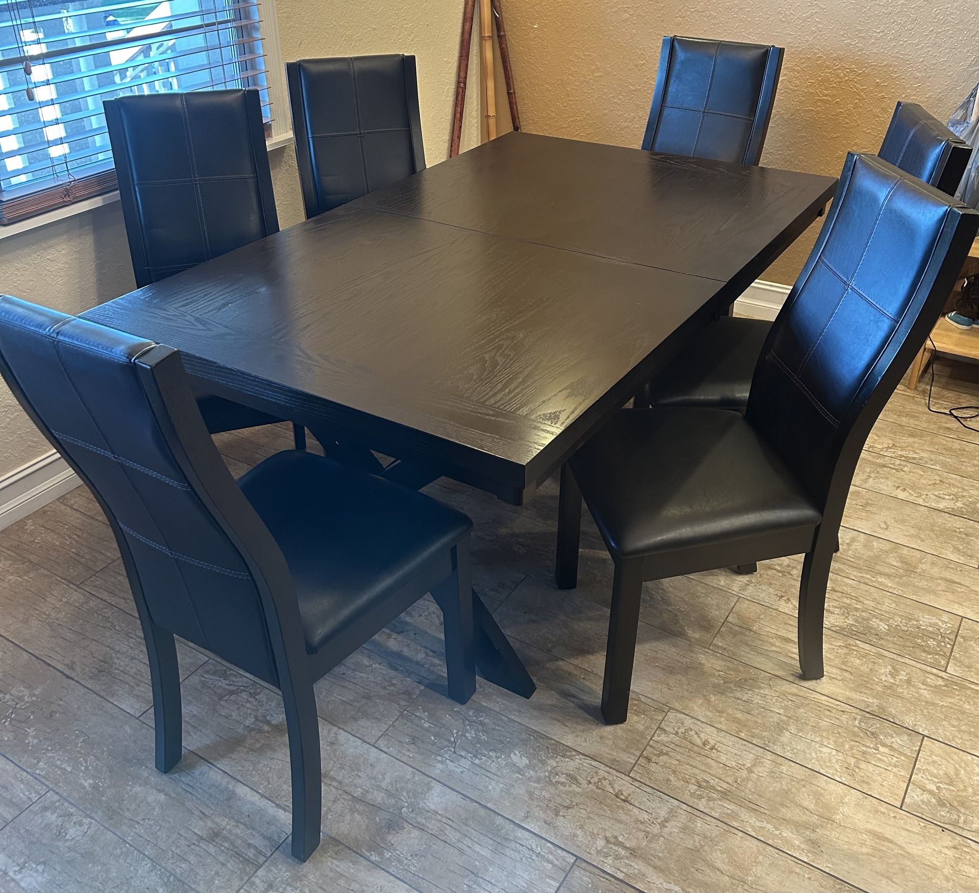 6 seat Dark wood dining table w/ 6 pleather chairs