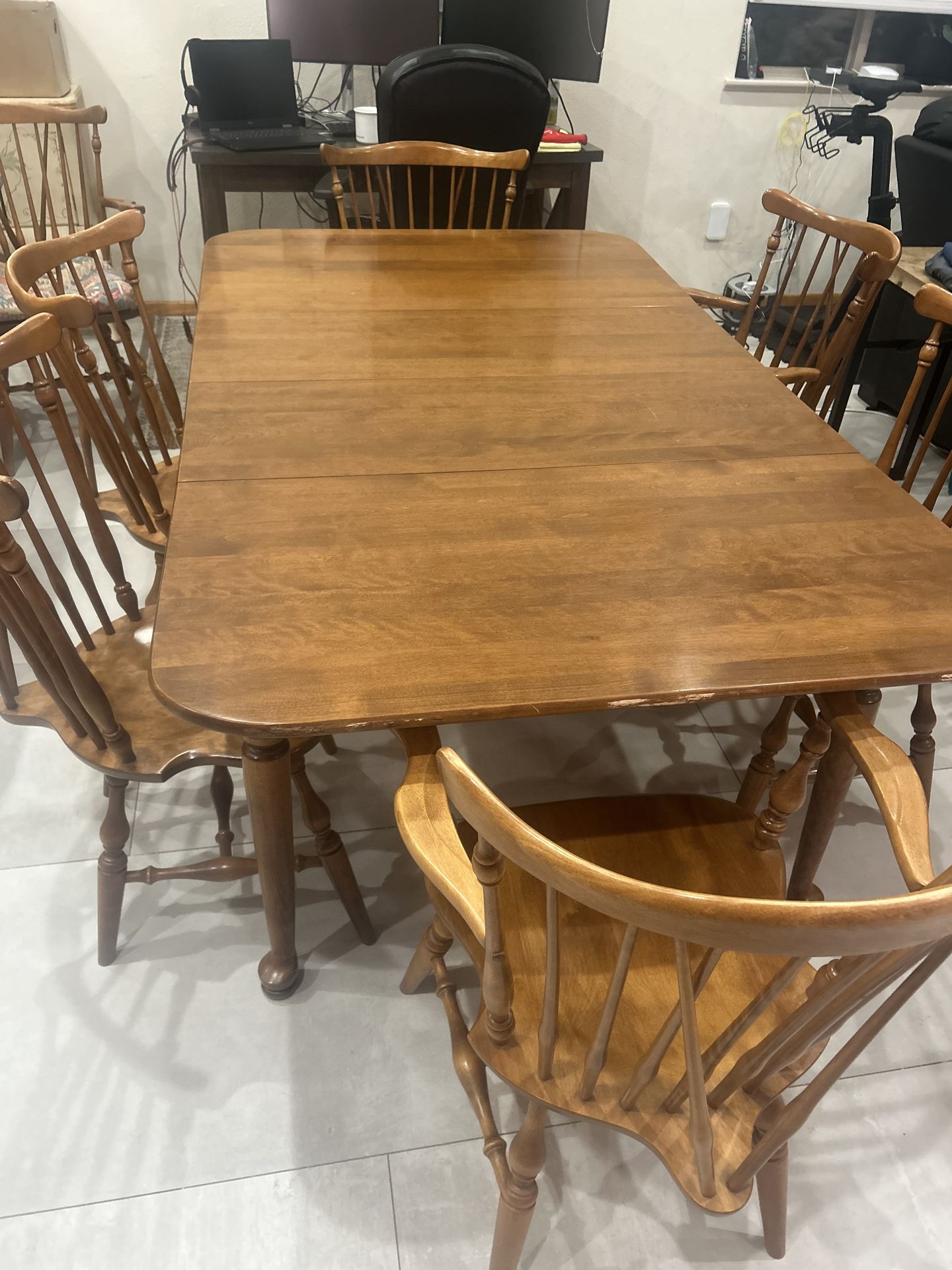 Beautiful Ethan Allen solid wood dining table set in cert good condition. Classic traditional style with turned legs and spindle-back chairs. Solid, sturdy construction — built to last. Includes table, 6 matching chairs, protective cover, and extra leaf for expansion. Table shows light wear consistent with normal use. Look at pics and video. Slight scratched. Haven’t tried anything to buff them out Dimensions: Table: 73” L x 42” W x 30” H Chairs: 35” H x 22.5” W x 17” D Seat Height: 17” Great for a family dining room or farmhouse-style space. Pickup required.