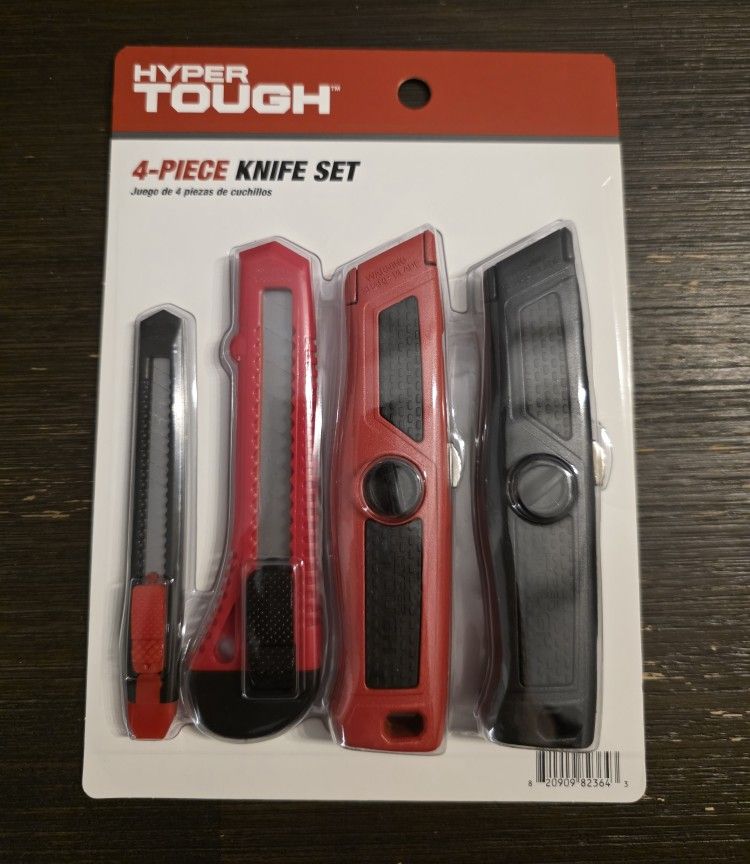 $7 Firm New. The Hyper Tough 4-Piece Knife Set makes a great holiday gift and includes essential knives for all your cutting needs Featuring sharp, durable blades and comfortable handles, these knives are perfect for kitchen prep, outdoor activities or everyday use Each knife offers precision and control, making slicing, dicing, ana chopping easier. Compact and reliable, this set is ideal for home cooks, campers and anyone needing quality knives in one convenient package