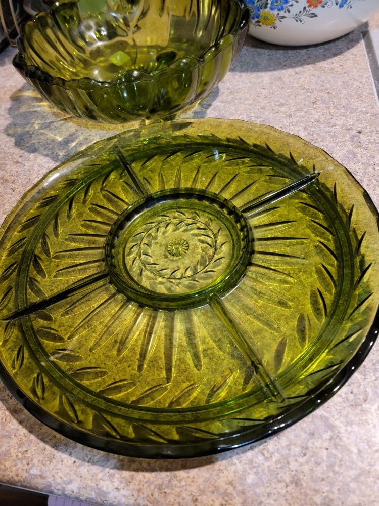Large Green Glassware 1960s Vintage Indiana Glass Anchor Hocking Divided Dish Platter 13" Large