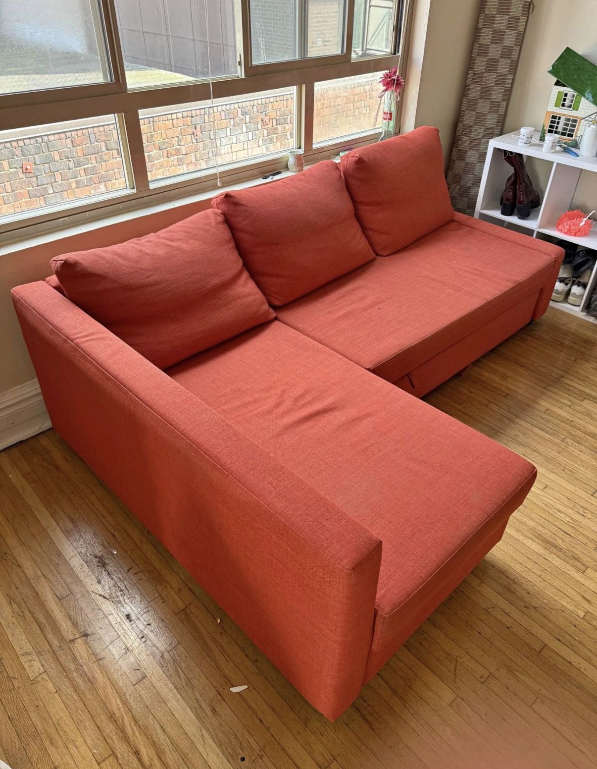 Reddish orange chaise sofa with storage, pulls out into bed. 90.5 inches wide 36 inches deep 60 inches deep for the chaise section ~33 inches tall, including cushion 26 inches tall excluding cushion Local delivery is available!