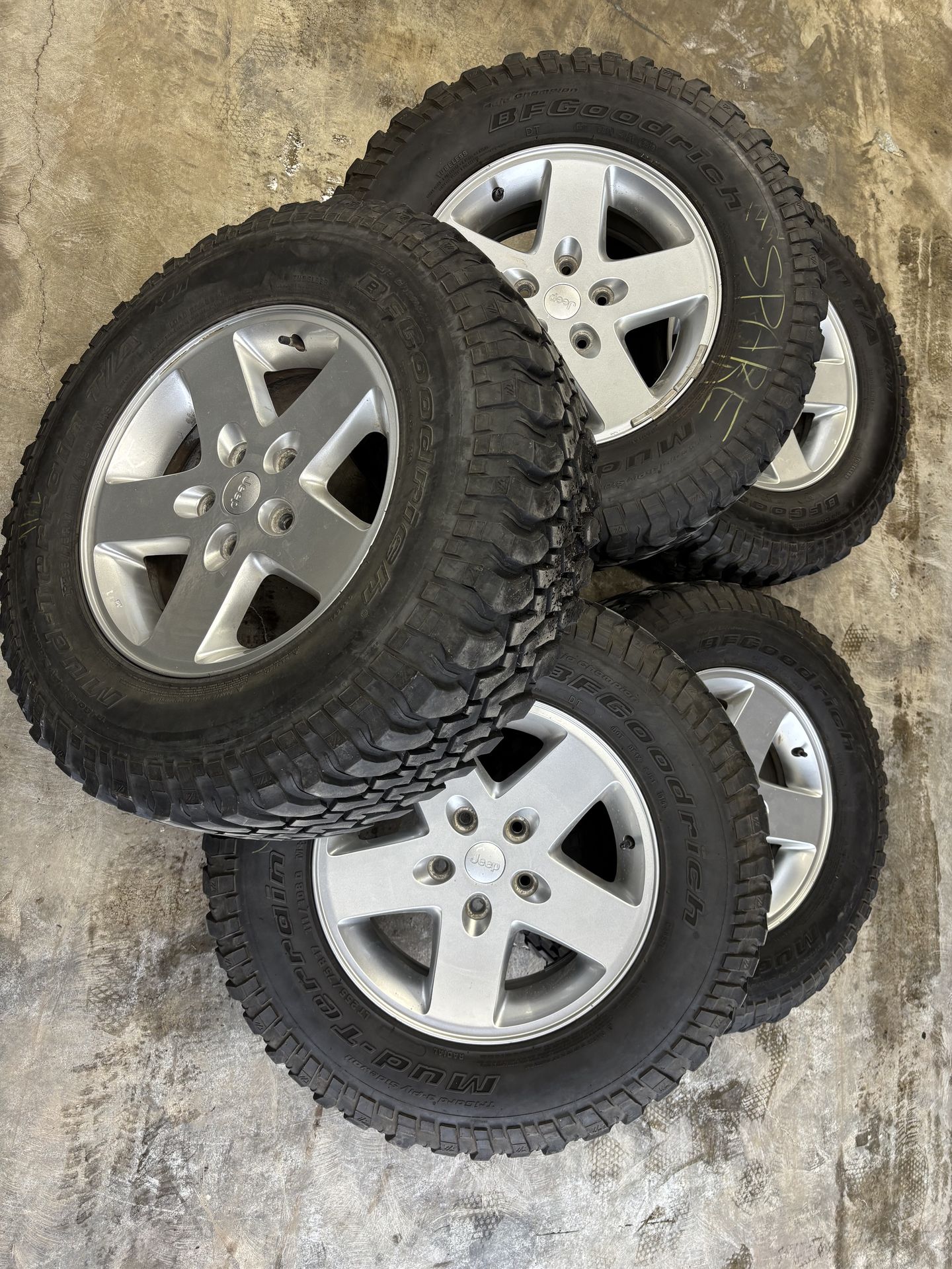 Used set of 2014 Jeep Wrangler 17x7.5 wheels with a 5x5 lug pattern. Tires are all date coded 2016 but show now signs of bead or sidewall cracking. Tires are BF Goodrich Mud-terrain KM that would have been OE tires on 2016 jeeps. All tires have been balanced and one is labeled spare due to a heavy spot in the tire. Tread depths are 2 @ 8/32 1 @ 9/32 1 @ 12/32 (spare) and 1 @ 14/32. A couple of the tires show signs of irregular tread wear but did not have any issues when I ran these of my Ranger for about 3000miles. These do have TPMS sensors in all 5 tires and they do read / work per the last photo. Please reach out if you have any questions.